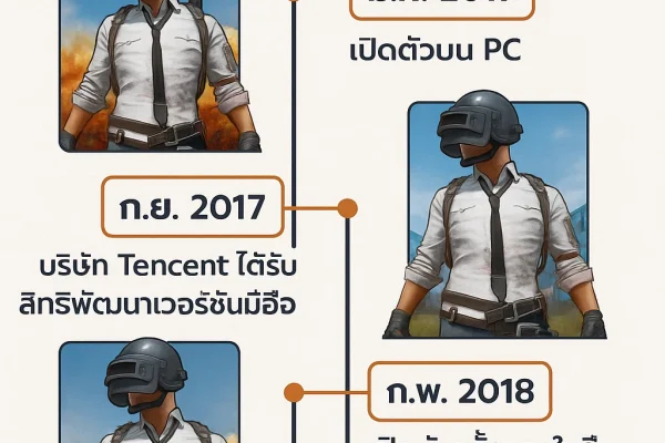 ประวัติและการพัฒนาของ PUBG Mobile จาก PC สู่สมาร์ทโฟน บทนำ PUBG Mobile จาก PC หากเอ่ยถึงเกมแนว Battle Royale ที่สร้างแรงสั่นสะเทือนให้กับวงการเกมทั่วโลกในช่วงครึ่งทศวรรษที่ผ่านมา หนึ่งในชื่อที่ถูกพูดถึงมากที่สุดคือ PlayerUnknown’s Battlegrounds หรือ PUBG เกมที่เปลี่ยนวิถีการเล่น Shooting จากการยิงเพียงเพื่อสะสมแต้ม มาเป็นการเอาชีวิตรอดจนเหลือผู้เล่นคนสุดท้ายบนสมรภูมิขนาดใหญ่ PUBG เปิดตัวครั้งแรกในเวอร์ชัน PC เมื่อปี 2017 ก่อนจะกลายเป็นกระแสระดับโลก และในเวลาเพียงไม่นาน Tencent Games ได้หยิบเกมนี้มาต่อยอดสู่เวอร์ชันสมาร์ทโฟนที่เรารู้จักกันในชื่อ PUBG Mobile ซึ่งกลายเป็นเกมที่ผู้เล่นหลายร้อยล้านคนทั่วโลกโหลดมาเล่น และเป็นจุดกำเนิดของอีสปอร์ตมือถือที่ยิ่งใหญ่ที่สุดเกมหนึ่งในปัจจุบัน จุดกำเนิดของ PUBG บน PC (2017) ผู้เล่นในยุคนั้นต่างเล่าว่า PUBG